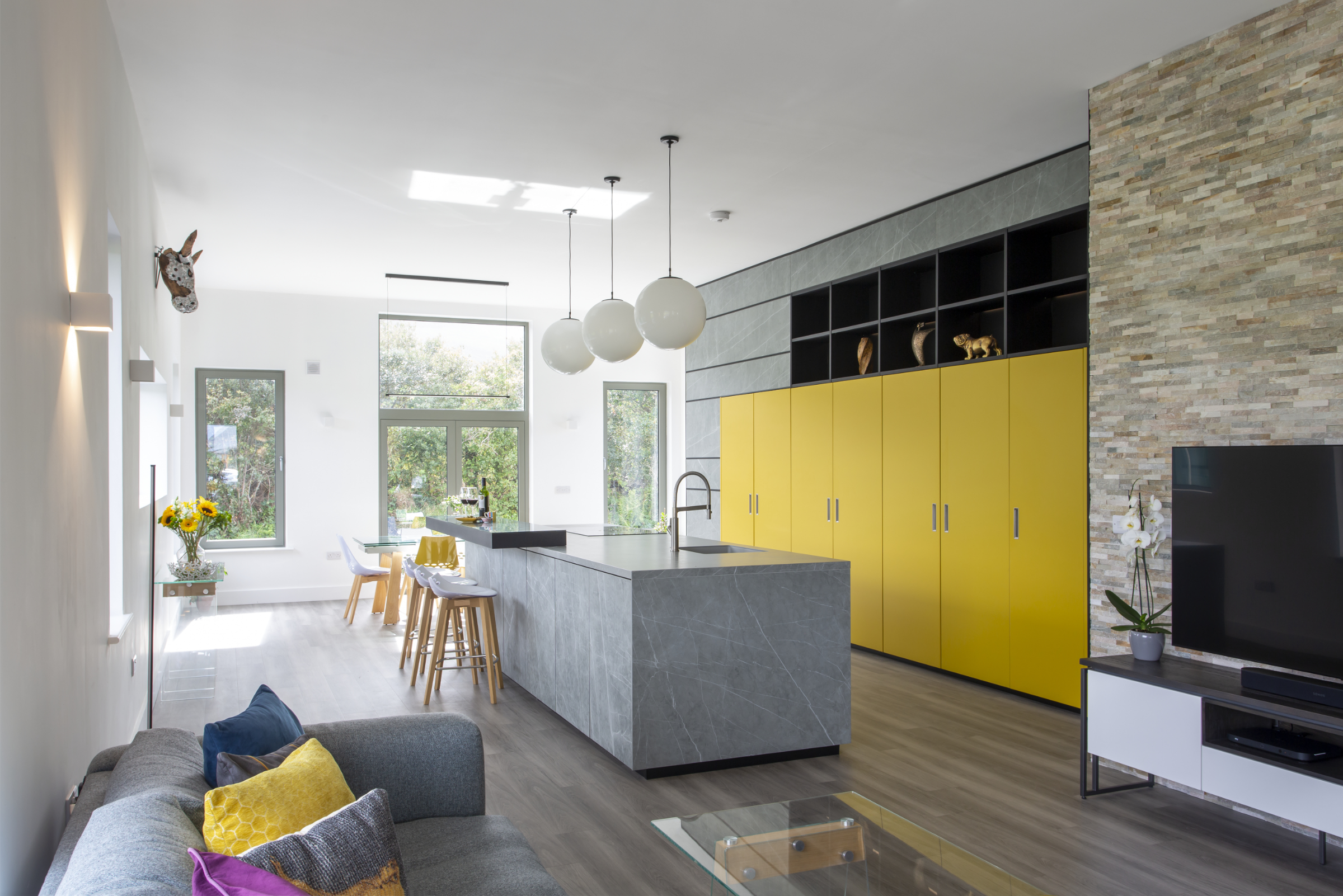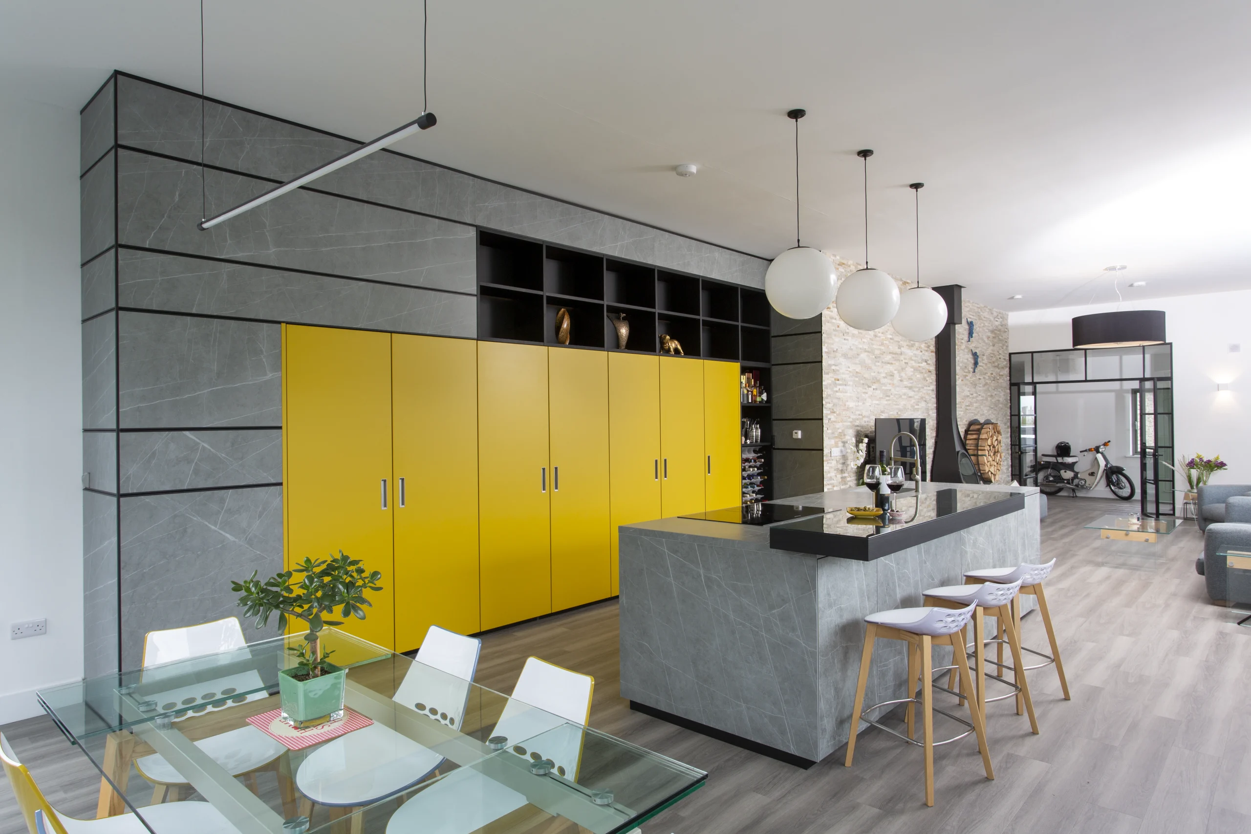 This next125 kitchen elevates bold colors to a whole new level. Featuring a sleek grey marble-effect backdrop, its vibrant core takes center stage. Behind this striking wall of color lies the heart of the kitchen, designed to meet all your cooking needs. Complemented by a spacious island, it offers near-endless storage, blending functionality with a show-stopping design.