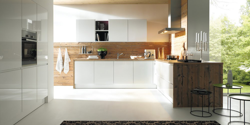 Fabulous High Gloss Kitchen, finished in crystal White colour and wrapped with a hard wooden worktop. This kitchen cleverly integrates modern styles while maintaining a cool natural feel.