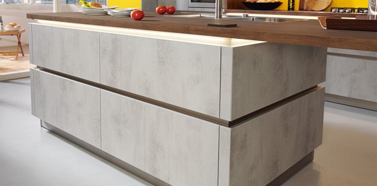 Discover the finely textured surfaces of the ELBA kitchen range in the modern concrete look.
