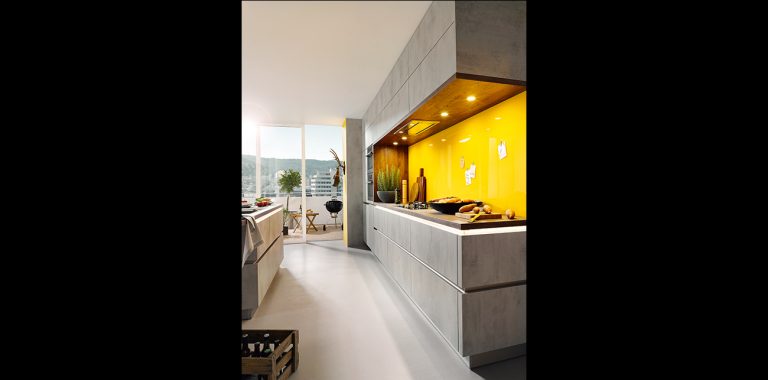 Discover the finely textured surfaces of the ELBA kitchen range in the modern concrete look This ultra modern kitchen includes all the essential elements of an ultra modern home with a charging station, blue tooth audio system and LED lighting.